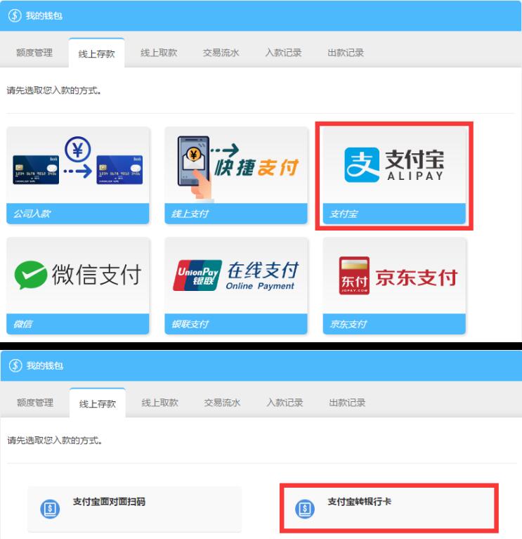电脑用户点击右上角登入,登入会员账号,点击屏幕右上方的线上存款。再点击支付宝,选择支付宝转银行卡