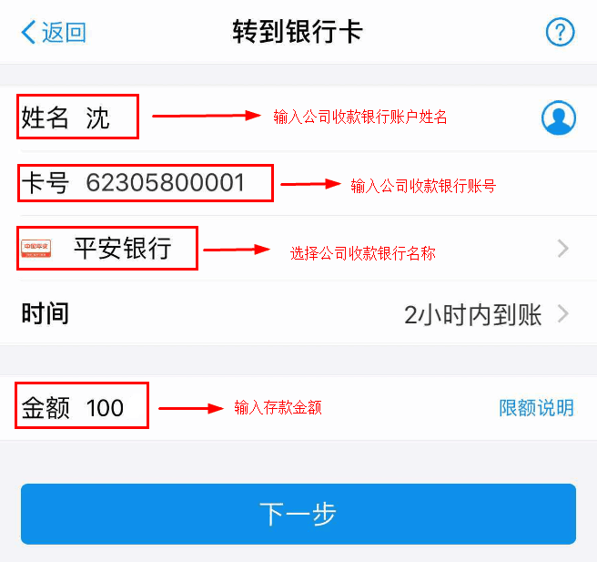 第四步:根据点击下一步根据提示完成转账。