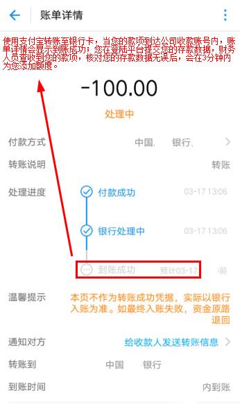 第五步:当您的支付宝款项到达公司收款账号内时,您的支付宝账单详情会显示到账成功,您在登陆平台提交下您的存款数据,财务人员在查收到您的款项,核对您的存款数据无误后,会在3分钟内为您添加额度,刷新页面即可查收。