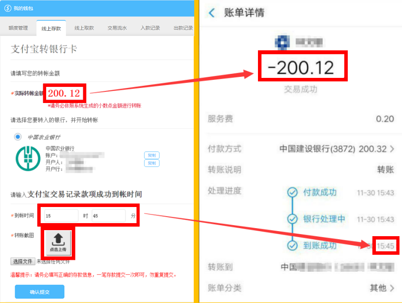 查看系统生成带有小数点的金额,记录好公司收款银行账户,使用支付宝进行转账(转账金额务必与带有小数点的金额一致);到账成功后按照提示填写到账时间,并上传您的转账详情截图,在点击确认提交(温馨提示:使用支付宝转账至平安银行是即时到账的; 务必先确认到账后,填写准确到账时间,再点击提交,否则财务人员查询不到款项无法第一时间帮您添加额度。)